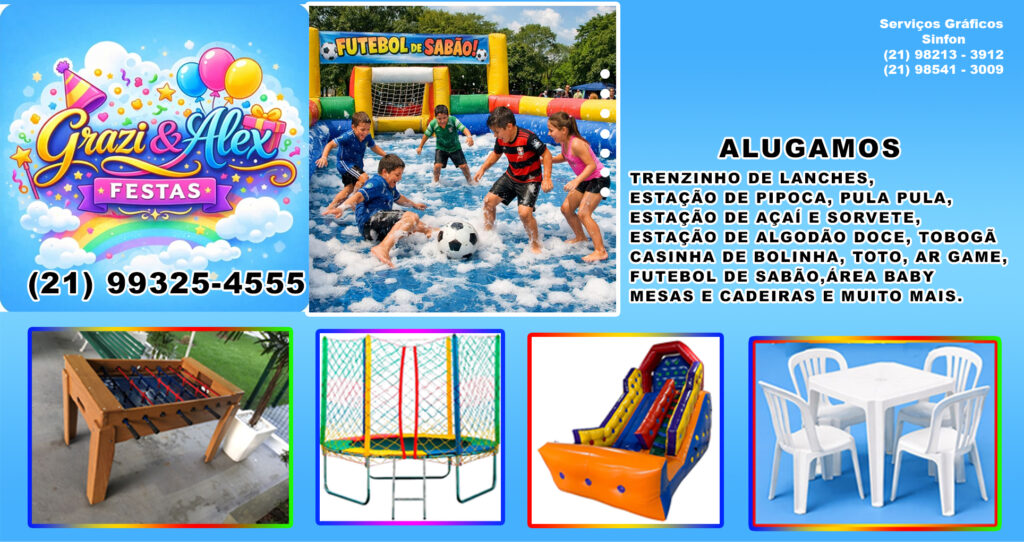 ALUGUEL DE BRINQUEDO, TRENZINHO DE LANCHES, ESTAÇÃO DE PIPOCA, PULA PULA, ESTAÇÃO DE AÇAÍ E SORVETE,ESTAÇÃO DE ALGODÃO DOCE, TOBOGÃ, CASINHA DE BOLINHA, TOTO, AR GAME, FUTEBOL DE SABÃO, ÁREA BABY, MESAS E CADEIRAS,